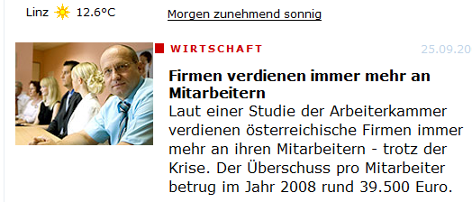 Az ORF mai híreiben az állt, hogy az osztrák Arbeiterkammer egyik tanulmánya szerint 2008-ban a gazdasági krízis ellenére a cégek egy dolgozó főre eső évi átlagos tiszta haszna elérte a 39500 €. Ez az összeg 56%-al magasabb, mint 2002-ben, amikor még híre hamva sem volt krízishangulatnak. Továbbá az is megállapítást nyert, hogy a dolgozói ráfordításokhoz viszonyítva a személyenként megtermelt tiszta nyereség hozzávetőlegesen 60%-al volt magasabb. Magyarán, 2008-ban minden egyes Euró, amit a cég egy dolgozóba fektetett, 1.60 Euró tiszta hasznot hozott a munkaadójának. A sajnálatos tény, amit a tanulmány is fájlal, hogy ezekből a busás nyereségekből, csupán csak a részvényesek húznak hasznot, maguk a dolgozók nem.
