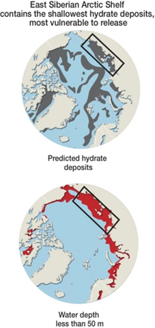 A mellékelt képen szürkével az északi féltekén fellehető metánhidrid lelőhelyek vannak bejelölve, alatta pirossal azok a kritikus rétegek, melyek ötven méternél sekélyebb parti övezetekben vannak. Ezek fognak ugyanis leghamarább elillanni és ez a cikk itt (Study Says Undersea Release of Methane Is Under Way) arról ír, hogy megfigyelések alapján kijelenthető, hogy a metánhidrid feltörése sajnos máris konkrét valóság. A cikk magyar címe, Tanulmányok állítása szerint a metán máris tör fel a tenger alól.