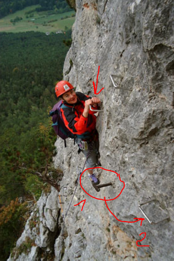 Az eredeti (régi) beszálló elé érve legelőször is meglepődtem, hogy eme hírhedett fal alacsonyabb és szerényebb, mint azt vad és csapongó képzeletem lefestette. Mielőtt nekilendültem volna, leellenőriztem nadrágom zsebeibe rejtett, a netről származó ajánlatok alapján magammal hozott különböző hosszúságú zsinegeket (Bandschlinge) és az extra HMS karabinert. Azzal riogatnak ugyanis, hogy az U-kapcsok helyenként áthidalhatatlanul távol vannak egymástól, és ez egy zsineg közbeiktatásával kivédhető. Nos, van egy jó meg egy rossz hírem. A jó az, hogy ha az Y-szárú kantár karabiner-fesztávolsága eléri a 1,50 métert, akkor erre a megoldásra nem lesz szükség. A rossz hír, hogy ott ahol nem alkalmazható önbiztosítás, mert egyszerűen nincsenek U-vasak, ott az említett módszerrel sem lehet sokra menni.