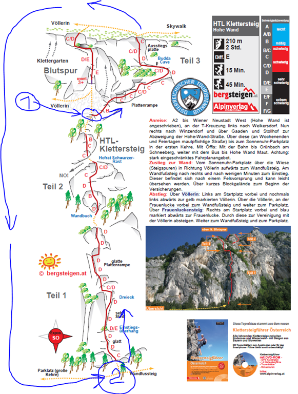 - Ha a felső harmaddal úgy végeztél, hogy sehol nem voltál a limiten, azaz, erőid nem fogytak el és ezért nem is kellet egyszer sem becsatolnod magad a beülőbe, akkor szépen legyalogolhatsz a Völlerinen a Wandfußsteigig ahonnan a HTL java indul. Nálam jól bevált (lásd a lenti falrajzot az útmutatásokkal).