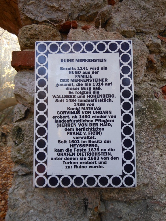 Az út elején van egy magyar történelmi vonatkozású várrom, Merkenstein. A tábla szerint (lásd a képet) Korvin Mátyás is meghódította, de csak alig négy évre.