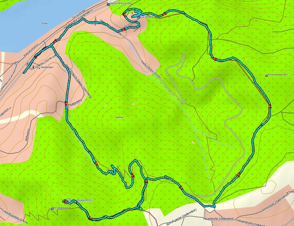 Így viszont csak egy kissé sárosra sikeredett erdei séta lett a délutánból. A tölgyes tavaly lehullott levelein lehetett a legjobban a csúszós agyagot kikerülni. Sajna az útvonal mindkét ígéretes attrakciója zárva volt. Az egyik, a Tempelbergwarte (Templomhegyi Kilátó) csak áprilistól tárja ki kapuit, Greifenstein vára pedig úgy tűnik, hogy hosszabb rövidebb időre teljesen kivonta magát a forgalomból. A várat ugyanis, internetes keresgéléseim szerint, 2010-ben privatizálták, miután 2006-ban kigyulladt és senkinek sem volt pénze a helyreállításhoz. Így, leégetten potom 3.5 millió € áron vette meg valaki. Nem sikerült megtudnom, mely új-grófi ivadék domíniuma lett. A birtok az óta is zárva és valószínűleg egy jó ideig így is marad. A vár miatt a közeljövőben tehát egyáltalán nem érdemes erre vetődni. Tulajdonképpen így üresen, kilátóitól fosztottan, a kerülő nem igazán gyönyörködtető, de ez is nyilván szubjektív megítélés kérdése.
