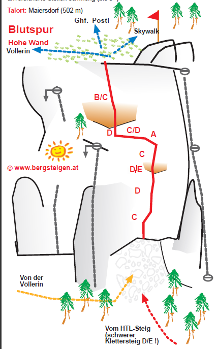 Az igazsághoz tartozik, hogy a Blutspur Klettersteiget (Hohe Wand) a tavasszal felújították és elvették az élét. Hivatalosan E-ről D-re szelídült, amit nem nagyon látok be, hiszen mint a mellékelt kép mutatja, a régi vonalvezetés (kékkel) alig-alig különbözik a mostanitól.