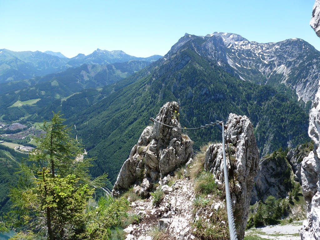 Nach Kurt Schall’s Klettersteigführer rechne ich mit drei D/E-Schlüsselstellen welche ich auch im Laufe meiner Kletterei erkennen zu glaube. Für mich persönlich ist die erste kurze D/E-Verschneidung der Unangenehmste. Nicht genug die senkrechte und glatte Felsformation, auch zwei Drahtseilenden treffen sich unglücklicherweise gerade hier, was das Umhängen zur echter Akrobatik macht.