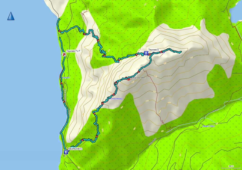 A Naturfreundesteig a nem egészen konvencionális leereszkedés garanciája. Az általam ez idáig megismert völgybeszálló ösvények és turistautak lankásabb szakaszokat is kínálnak, különösen az erdősávban (pl. Schneeberg, Rax, stb). A Naturfreundesteigen szó sincs ilyesfajta lazsálásról. A Traunsteinhausnál (Naturfreunde menedékház, a másik menedékház) kezdődő Naturfreundesteig, mindvégig nagyon meredek. Az 1300 méteres leereszkedés végig nagy figyelmet, biztos lépéseket igényel. Karból is kell dolgozni a drótkötéllel és kapaszkodókkal ellátott szakaszokon. Kletterező, vagy valamiféle ehhez hasonló kesztyű kifejezetten ajánlott.
