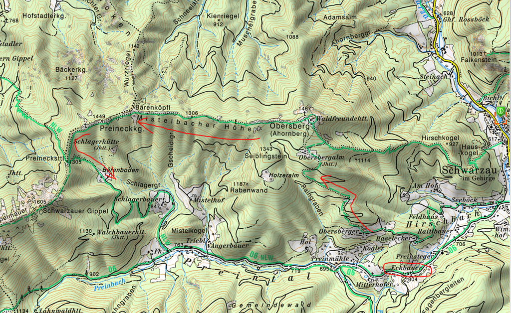 Az Obersberg alatti Prein völgyből szándékoztam indulni, hogy keletről nyugati irányban haladva végigmasírozzak a Mistelbacher Höhe névre keresztelt hegygerincen. Hajnalhasadtakor fordultam rá az Eckbauer gazdasági udvarhoz vezető jócskán emelkedő hegyi útra, mely túrám kiindulópontjához vezet. Az elmúlt napok fagyos időjárása jégpáncélt varázsolt a felfelé kanyargó út felületére ami elég hatásosan hárított minden hólánc nélküli közeledési szándékot. Egyszerűen elforogtak a kerekeim. Összkerék meghajtással bizonyára szerencsésebb lettem volna. Így azonban semmi kedvem sem volt a hólánc felszerelésével piszmognom. Váltottam tehát a B tervre és visszatolattam egy olyan pontig, ahol némi gonddal ugyan, de mégis sikerült megfordulnom. Néhány perc múltán aztán begurultam az álmos Schwarzau im Gebirge főterére.