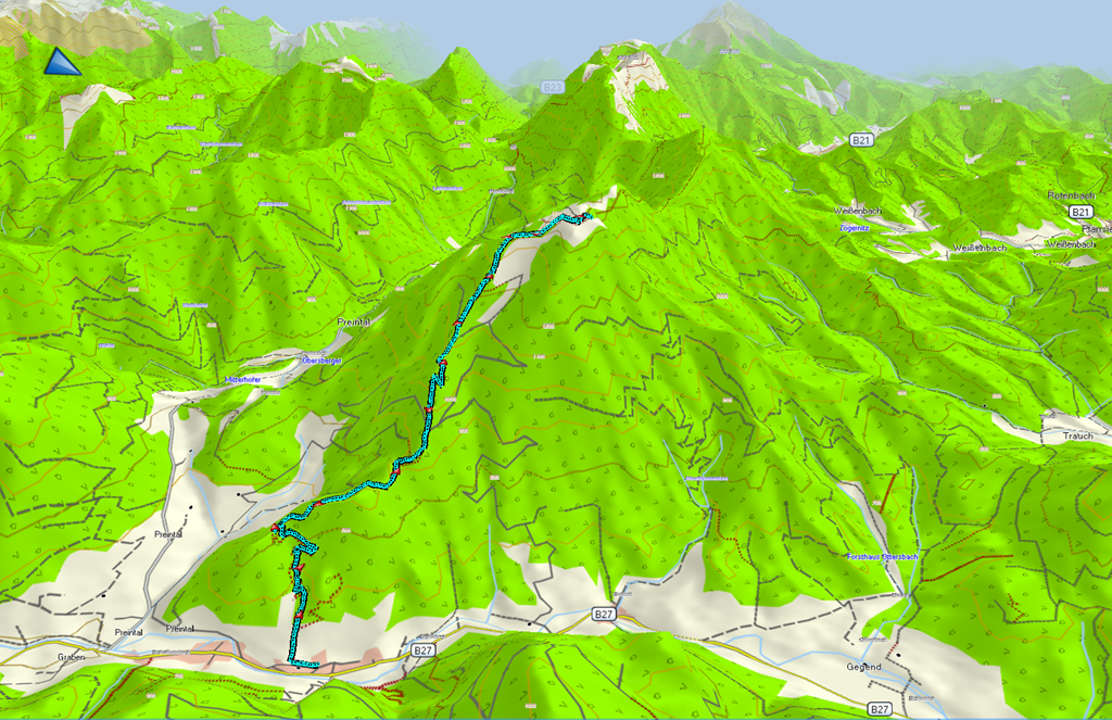 Úgy terveztem tehát, hogy felmászom az Obersbergre a februárban megismert turistaúton és ezután egy kört leírva déli irányban ereszkedem le a Preintalba. Az eredeti elképzeléshez képest ez ugyan egy jóval rövidebb variáns, de ezzel is beértem volna. Pedig akkor még fogalmam sem volt róla milyen irdatlan mennyiségű hó van fenn csúcsközelben és a gerincen. Úgy gondoltam, hogy a kevéske fehérség, ami a környéken mutatja magát, nem jelenthet komoly akadályt. Hótalpak nélkül indultam tehát, mivel a használatát nem tartottam szükségesnek.