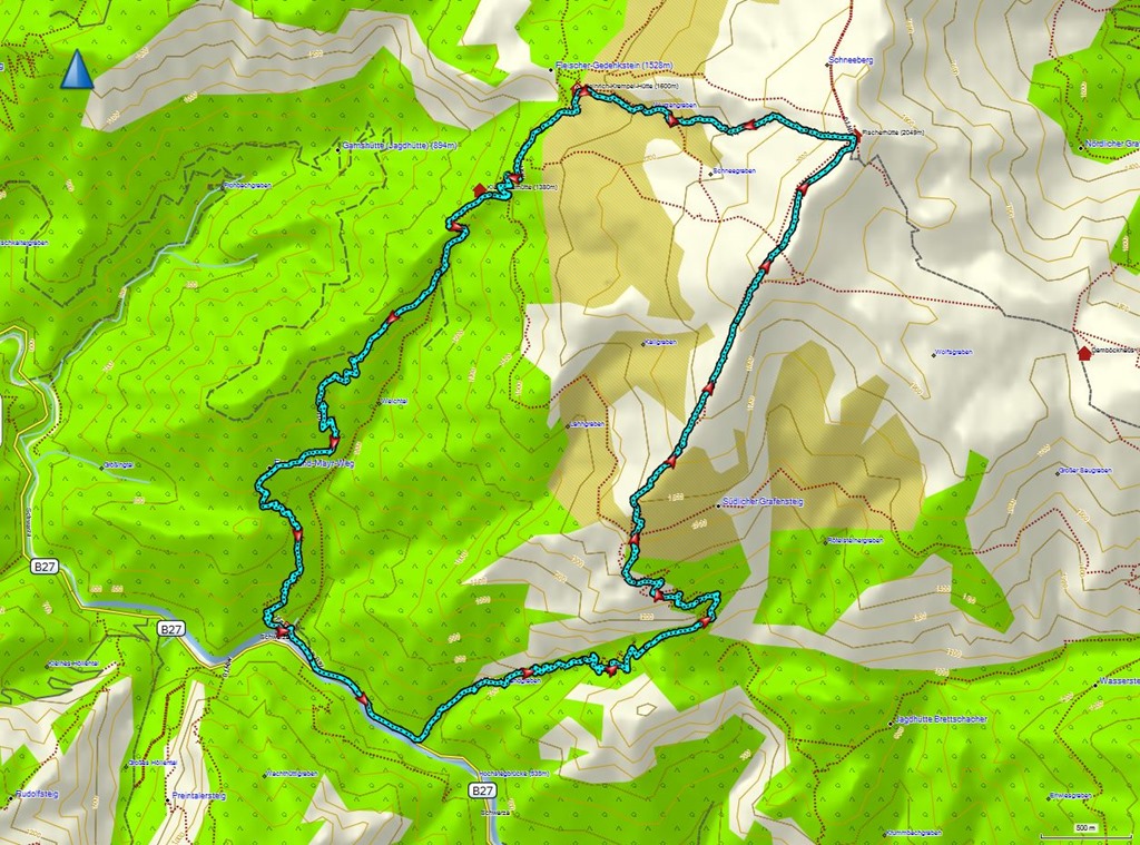 Ez a Schneeberg tetejére (Klosterwappen 2076m) vezető több mint nyolcórás körút egy kemény kondícióteszt, melynek során majdnem 1600 méter szintemelkedéssel és 15 kilométeres távval kívántam szembesíteni önmagamat. A megpróbáltatásokhoz hozzájárul az út első jelöletlen szakaszán a tájékozódásban való jártasság illetve az alapfokú nyomolvasás-nyomkeresés szükségessége.