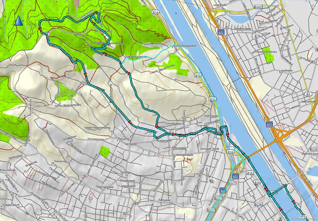 Első valamirevaló hegyi biciklizésem során végre bevettem a Kahlenberget, igaz, nem a rettegett Eisernehandgassen át, hanem egy fél fokkal szerényebb kaptatón. A Freudenau-i vízerőműnél rajtoltam, végig a Duna partján karikázva majd Nußdorfban kanyarodtam rá tulajdonképpeni tüdőköptetős szakaszra. Összesen 40km és cirka 500m szintemelkedés.
