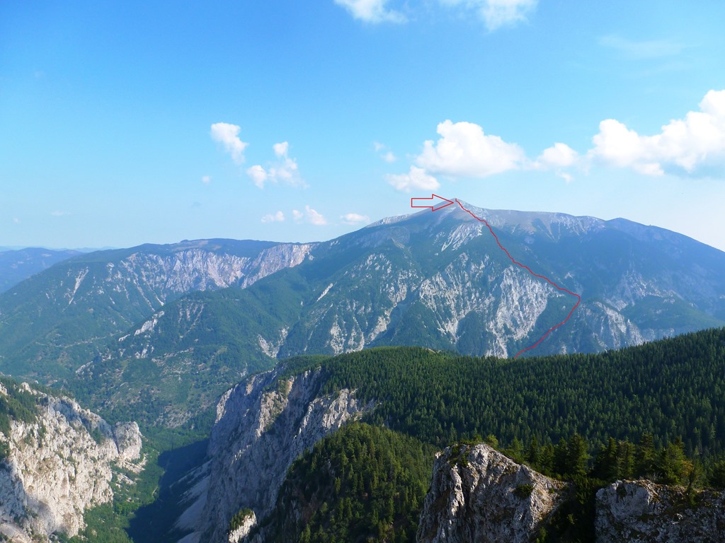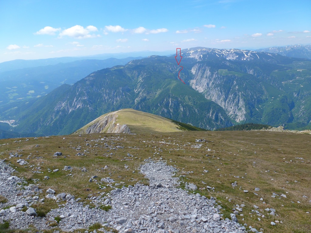 Az alábbi képek a Höllental két átellenes oldalán készültek. Az elsőn a Schneeberg illetve a Klosterwappen látható a Höllental-kilátóból tekintve (“pokol tornáca”), a másodikon pedig a Großes Höllental és a Höllental-kilátó a Schneeberg tetejéről nézve. Nyilakkal jelöltem a képek felvételének vélhető helyszíneit. A piros vonalak a feljutás útvonalainak körülbelüli pontossággal történő ábrázolása (már ami látható belőlük).