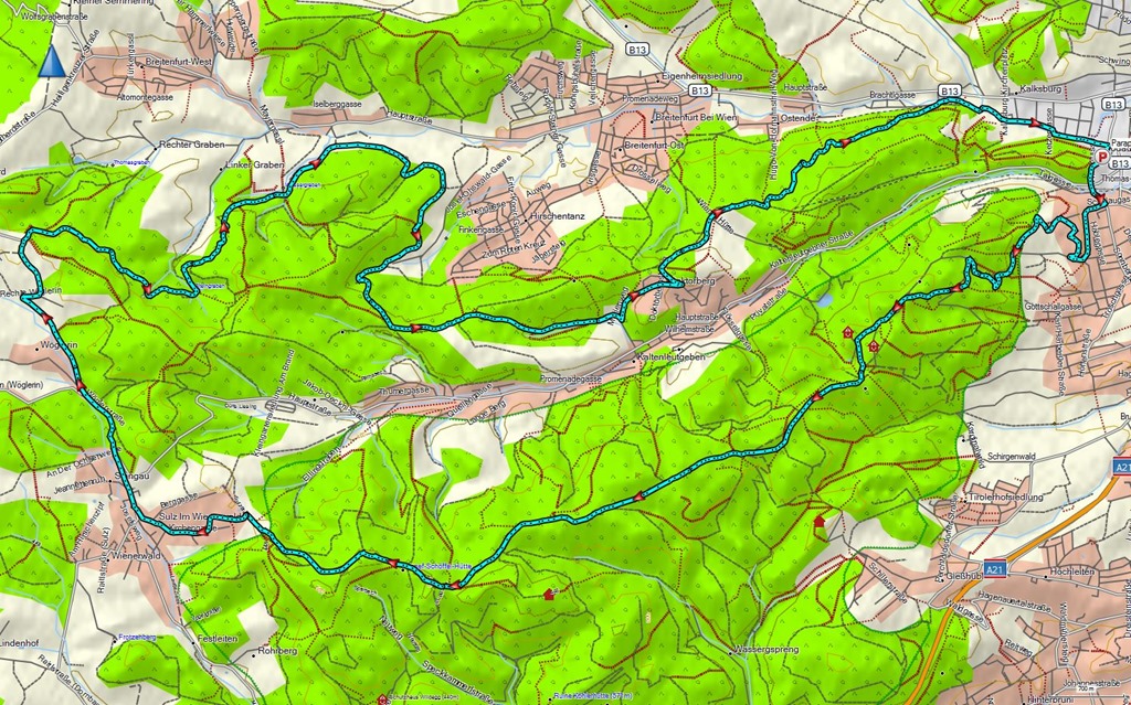 A táv (Bécs-Rodaun, Parapluieberg, Sulz, Doktorberg) cirka 33 km, 765m szintemelkedés, bruttó 2:30 óra
