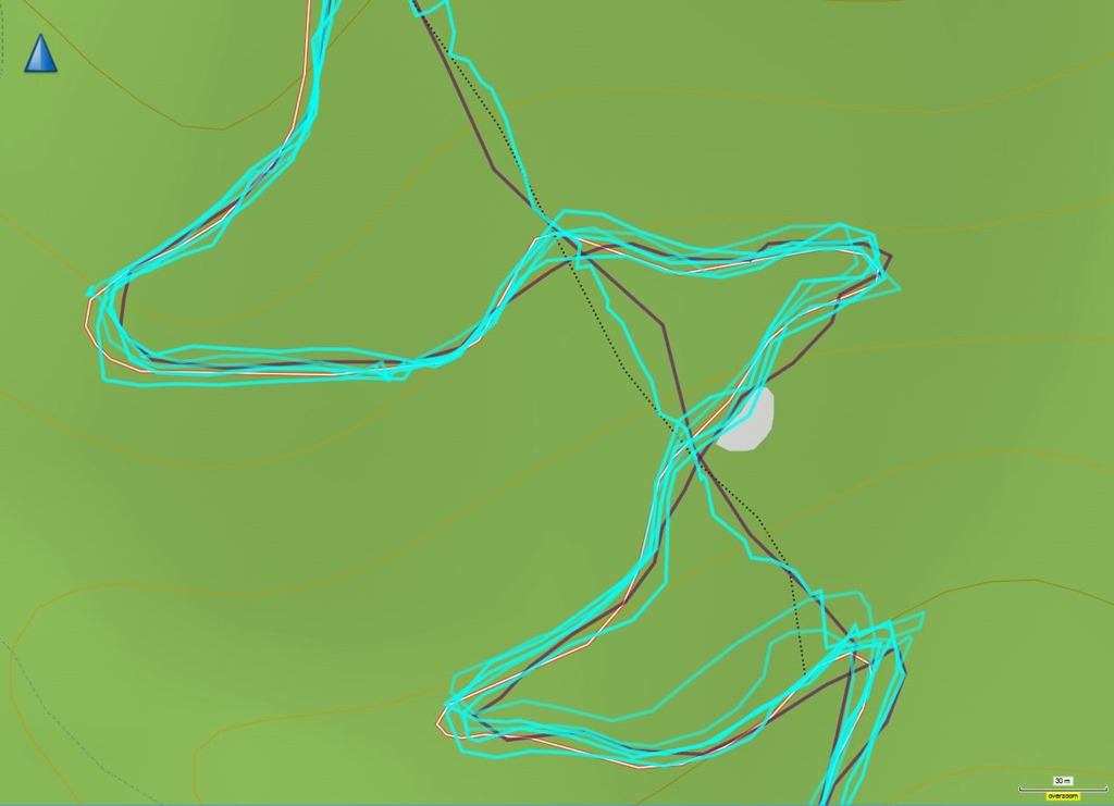 - Jól megfigyelhető, hogy egy a térképen berajzolt út és a valós ösvény nincsenek mindíg takarásban (egy nyomvonal valamelyest eltérhet a térképen feltüntetett vonaltól).