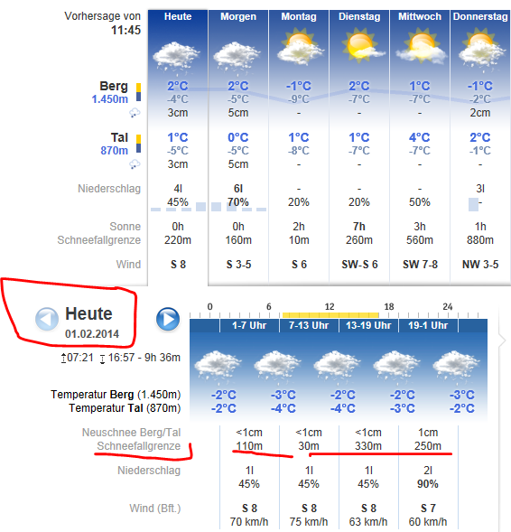 Mönichkirchenbe még pénteken is porhóval csalogatták a népet, na meg azzal, hogy minden lift és pálya nyitott. Az időjárás jelentés tüzetes elemzése is (lásd a képet) Mönichkirchent egy közeli jó alternatívának tüntette fel, mert a még mínusz fokokkal kecsegtető, hidegebb, déli áramlás az útjába talált esni. Eszerint a hóhullás határa 200m tengerszint feletti magasság. Lévén a sílift völgyi állomása 1000 méteren, előre örvendeztünk némi lágy hópihehullásnak.