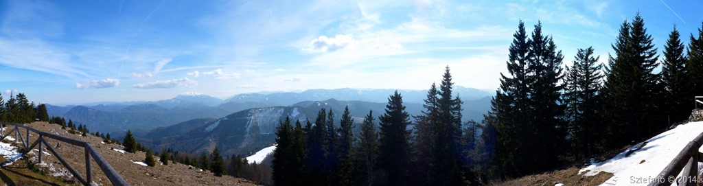 Panoráma a Türnitzer Hütte teraszáról, balra a Schneeberg jellegzetes hókupolái.