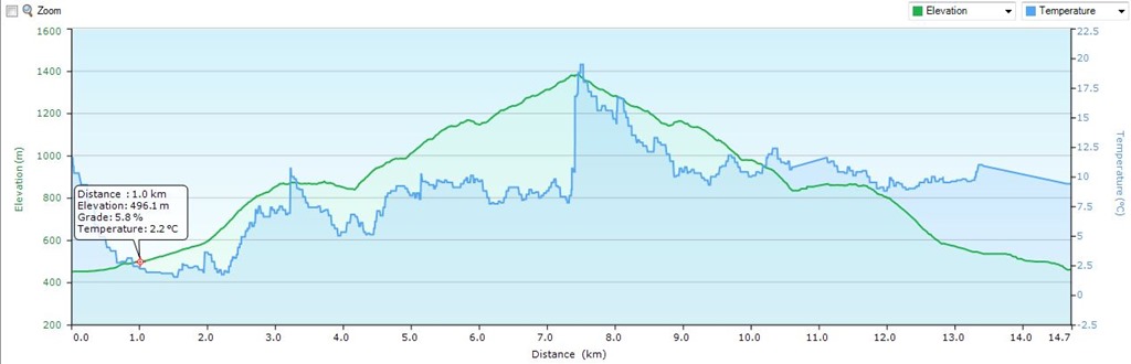 A túra különlegessége az említett “hullámvasutazás”. A Geiersteint elhagyva, kilométereken át szűnni nem akaró kaptatók és lejtők sorozatán át, 860m tengerszint feletti magasságban haladunk (+/- 20m) majd egy 200 méteres meredekebb felszökés után a korábbi ábra 1100m körül megismétlődni látszik. A tavalyi falevelek helyenként 30-40cm vastagságban borítják az ösvényt. Óvatosan araszolgatunk, mert az avarréteg alattomos sziklákat ist rejt.