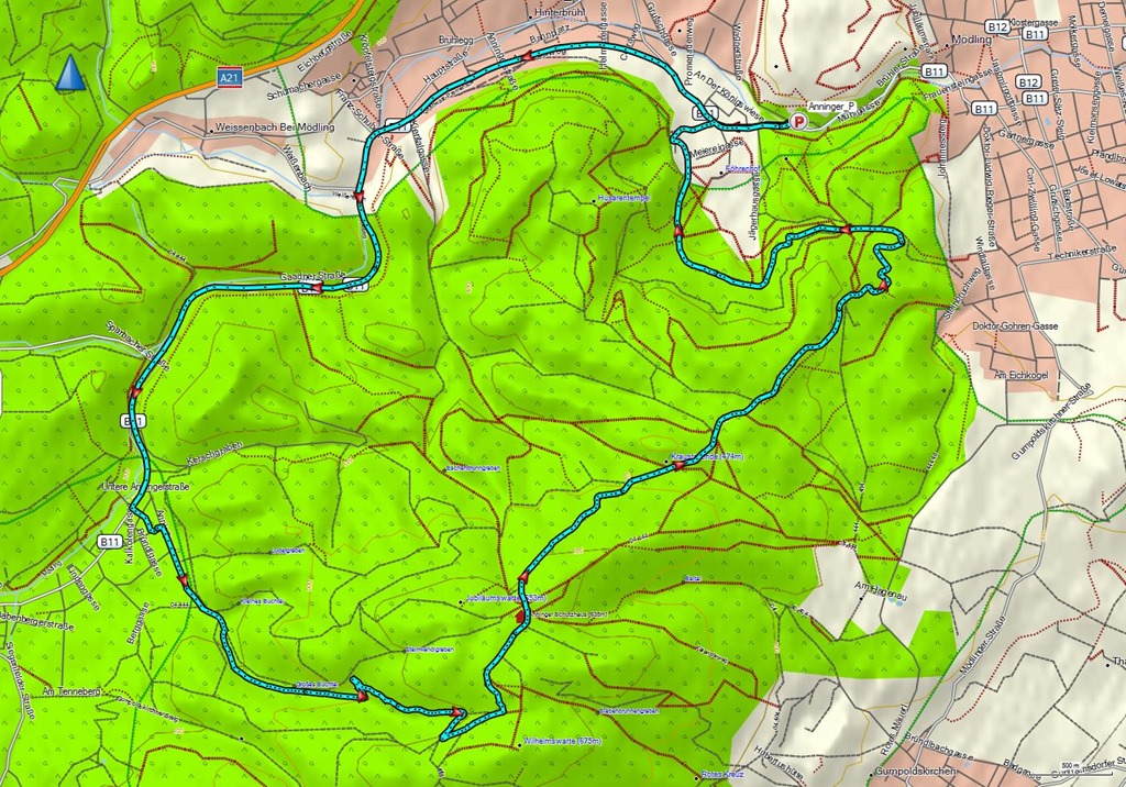 Nyomvonalam letölthető. A táv (Mödling, Anninger, Mödling) cirka 17.5 km, 440m szintemelkedés, bruttó 1:35 óra. Kékkel a hőmérséklet változása. |