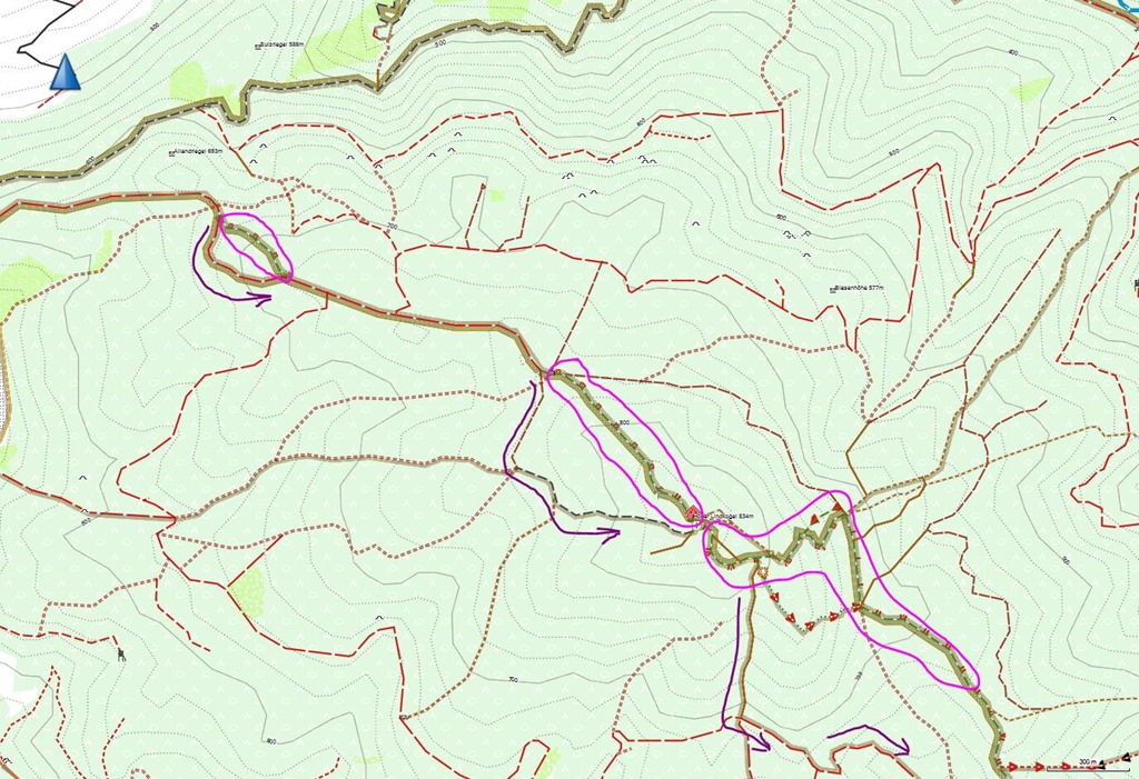 A http://openmtbmap.org –ról letölthető térkép elég világosan adja a tudtunkra, hogy itt hamisítatlan gatyarohasztó szakaszokról van szó (ún. power trail). Lásd az alábbi részleten a rózsaszínnel keretezett szakaszokat. Lilával jelöltem az esetleges áthidalásokat (ún. bypass). Az első ilyen “rémes” szakaszt rendre ki is kerülöm majd a végső felszökés alá érve úgy döntök, hogy bátor leszek és megízlelem az igaz lindkogelos gatyarohasztást.