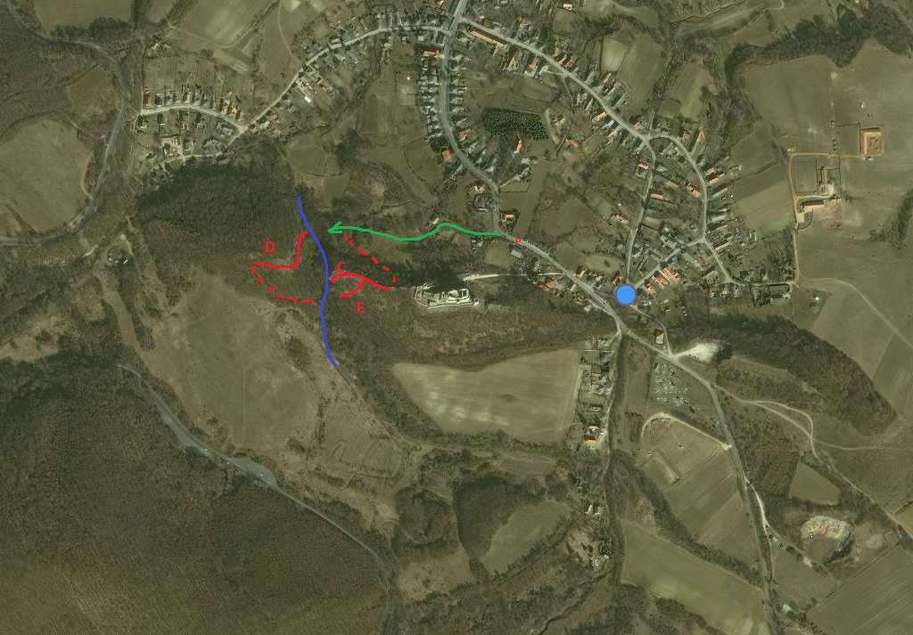 A gyalogút (zöld) a szurdokhoz, északról kerüli meg a várat. Piros folytonos vonalak jelzik a ferratákat (már amennyire megsaccolható), szaggatottal a szurdokba visszavezetö ösvények.