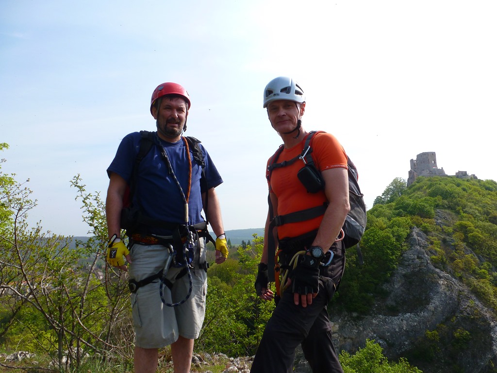 Attilával, blogom egyik szorgalmas olvasójával érkezünk a vár tövébe, hogy próbát tegyünk. A parkolóból kiindulva, néhány perces lefelé tartó séta után egy régi temetőt keresztezünk, majd innen meredek partszakaszon lefelé, egyenesen a szurdok alján találjuk magunkat. A kiszáradni látszó csermely, impozáns, átellenes falán indul a Várpanoráma út. Két helyen C/D ízű felszökéssel van megtűzdelve ez az átlagban C nehézségi szintű ferrata. Mivel a sziklafal magassága erősen korlátozott, túlteng a traverz, ami engem az E60-as Klettersteigre (Flatzer Wand) emlékeztet.