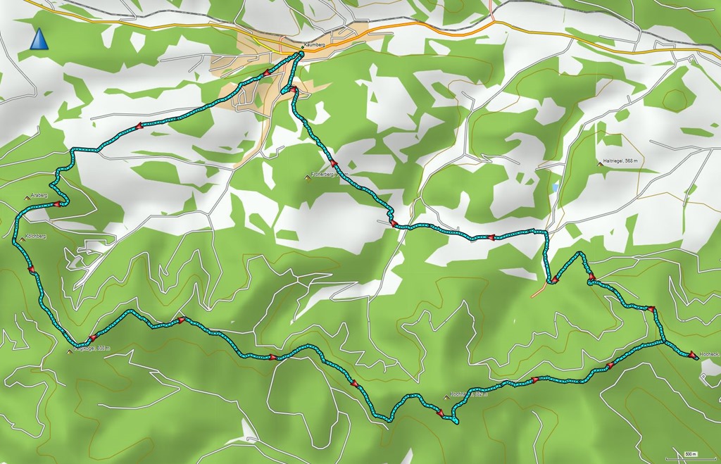 A Kaumbergből, Araburg érintésével a Hochecket megcélzó túra, első pillantásra hosszúnak, de ártalmatlannak tűnik. Az út Araburgnál eléri a 800m szintet majd 10 kilométren át hullámvasutaztat le és fel. A Vörös Keresztnél található nyeregben aztán meglódul és folyamatos meredek kaptatók sorozatán át visz 723 méterről 1037-re.