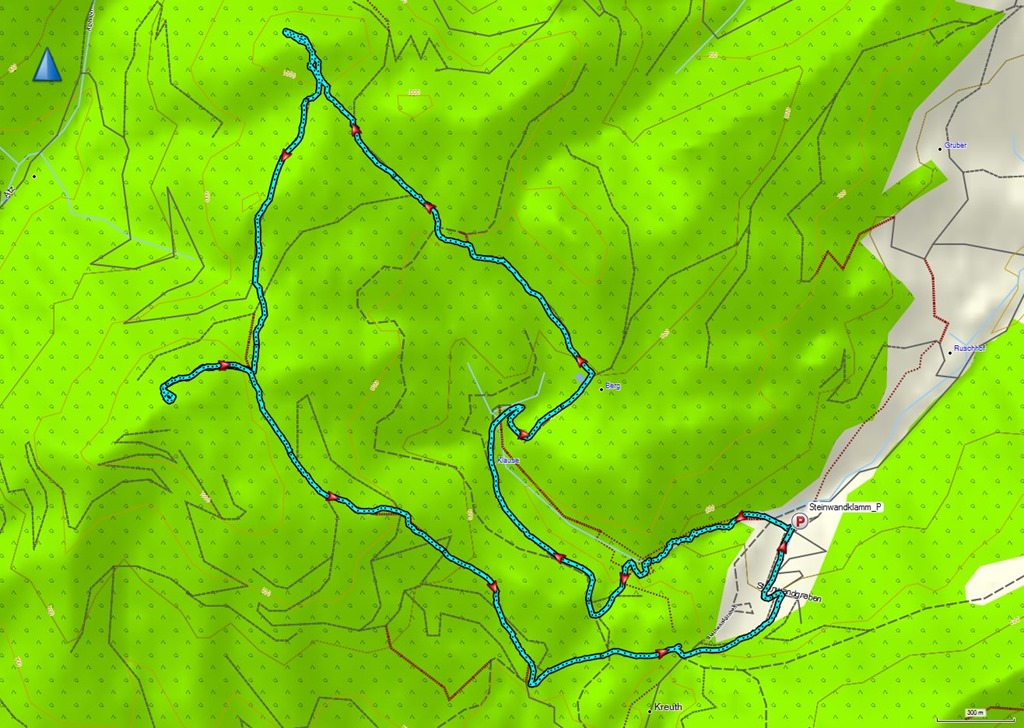 | Nyomvonalam kérésre hozáférhető. A táv (Steinwandklamm, Rudolf Decker-Steig, Kalter Berg, Almesbrunnberg, Jagasitz, Steinwandklamm) cirka 10 km, 700m szintemelkedés, bruttó 4:15 óra. |