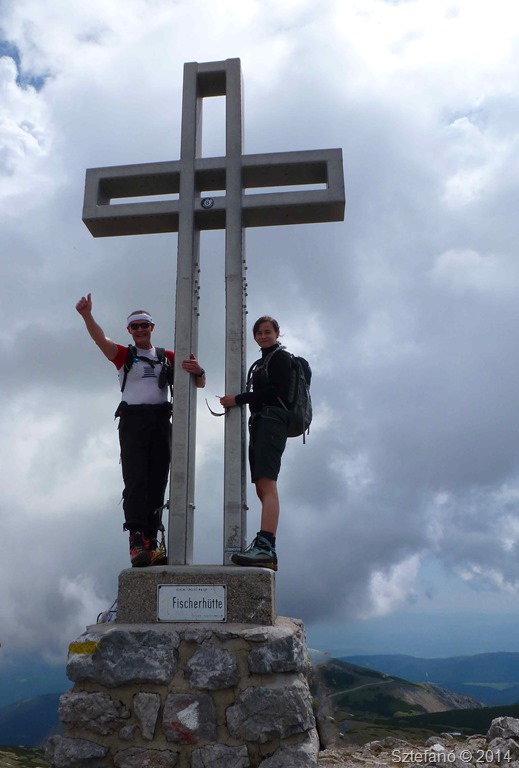 Folytatjuk utunkat a Klosterwappenra. Egy darabon követjük a Grafensteig vonalát, majd a kék jelzésen jobbra térünk és egyenesen a csúcsra törünk. Az útbaigazító tábla szerint két órás lesz az utunk. Fél tizenegykor veselkedünk neki a Kinetalerhütteből, de nem sokkal déli 12 előtt már érkezünk a csúcskereszthez. Ezek szerint jó kondiban vagyunk. Cirmi engem is felülmúl. Hosszasan vár rám fenn, hogy utolérejem.