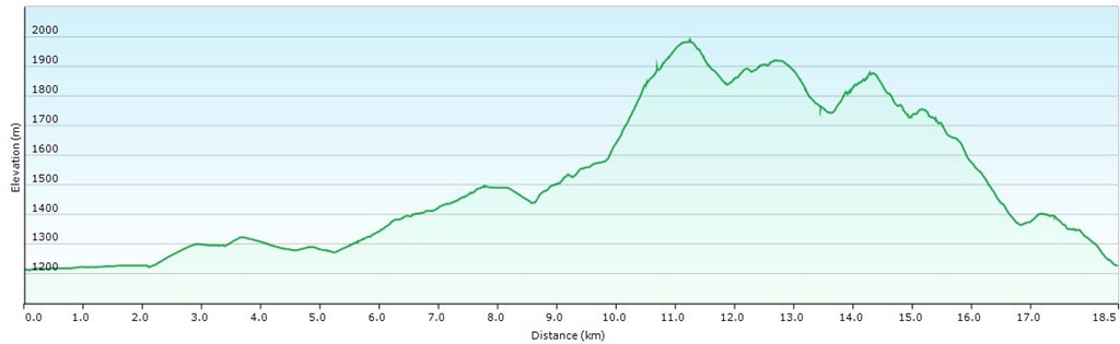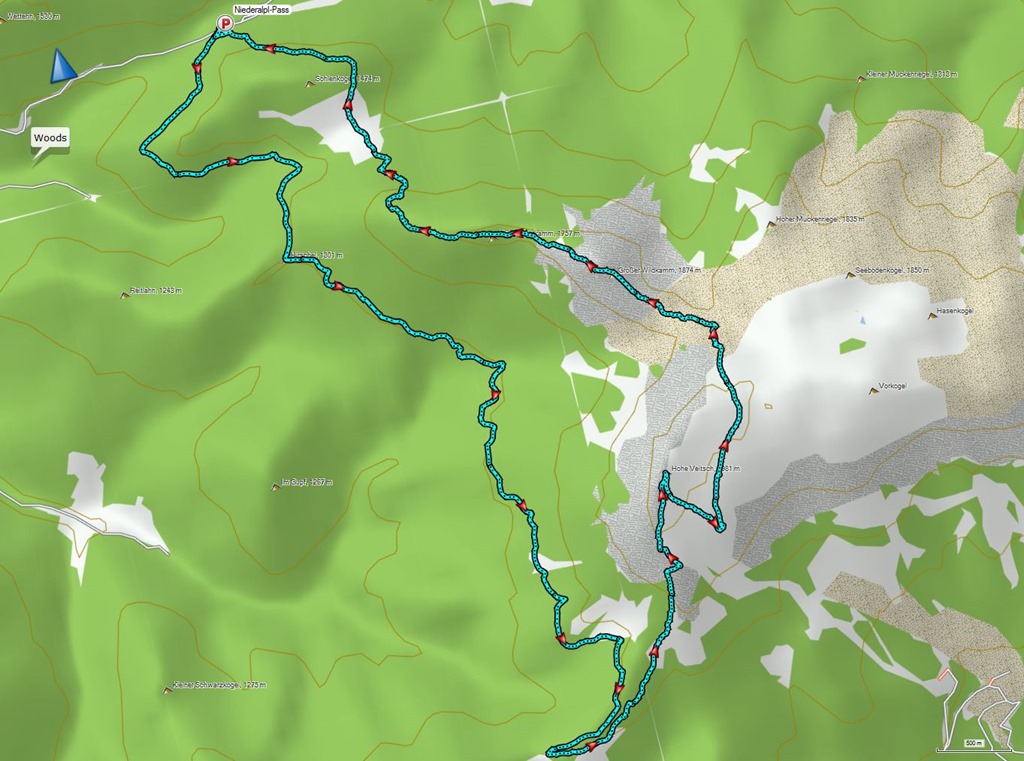 A változatosság kedvéért most nagyobbacska kerülővel közelítem meg a Veitsch masszívumát. Mint a fenti profilból is jól kivehető, az út itt felér egy idillien kellemes sétával, mely helyenként szép fenyves erdő mélyén, máskor meg széles erdei úton halad. A kihívások a Rothsolalm feletti útkereszteződésben (Nikolokreuz), az Ördögösvénnyel (Teulefessteig) kezdődnek.