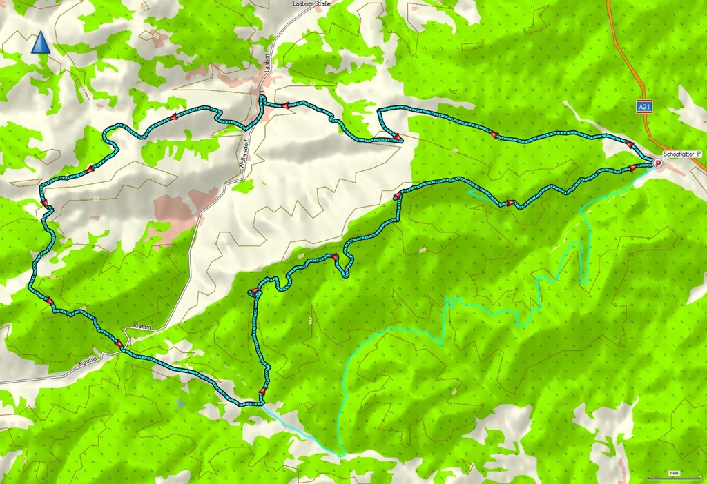 Persze azért óvatos vagyok és tanulmányozom a körút profilját. Hivatalosan az óramutató járásával megegyező irányban, három csúcsot érint a túra. Az első a Schöpfl (amit más ismerek), majd jön a Gföhlenberg és a végén ráadásnak a Hochberg. Ha a hegyi biciklis írónak is tolnia kellett a bringáját, akkor nem látok esélyt arra, hogy ez nekem sikerüljön. Észreveszem viszont, hogy fordított irányban a kaptatók mérsékeltebbek. Arra gondolok tehát, hogy ha felfelé menetben nem lehet nyeregben maradni, lefelé tán ez még sikerülhet.