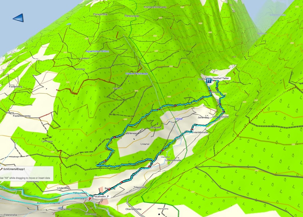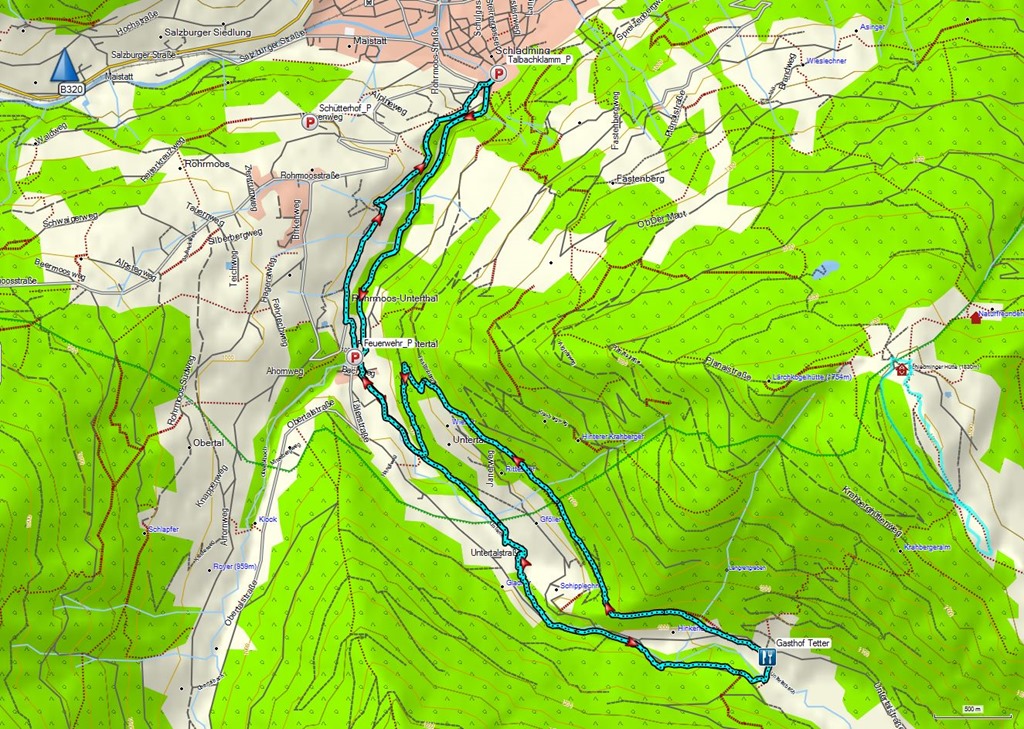 | A táv (Feuerwehrdepot, Alte Mühle, Gasthof Tetter, Höhenweg, Untertal) cirka 9 km, 330m szintemelkedés, bruttó 3:00 óra. Ábra szerinti gpx-nyomvonalam kérésre hozáférhető. |