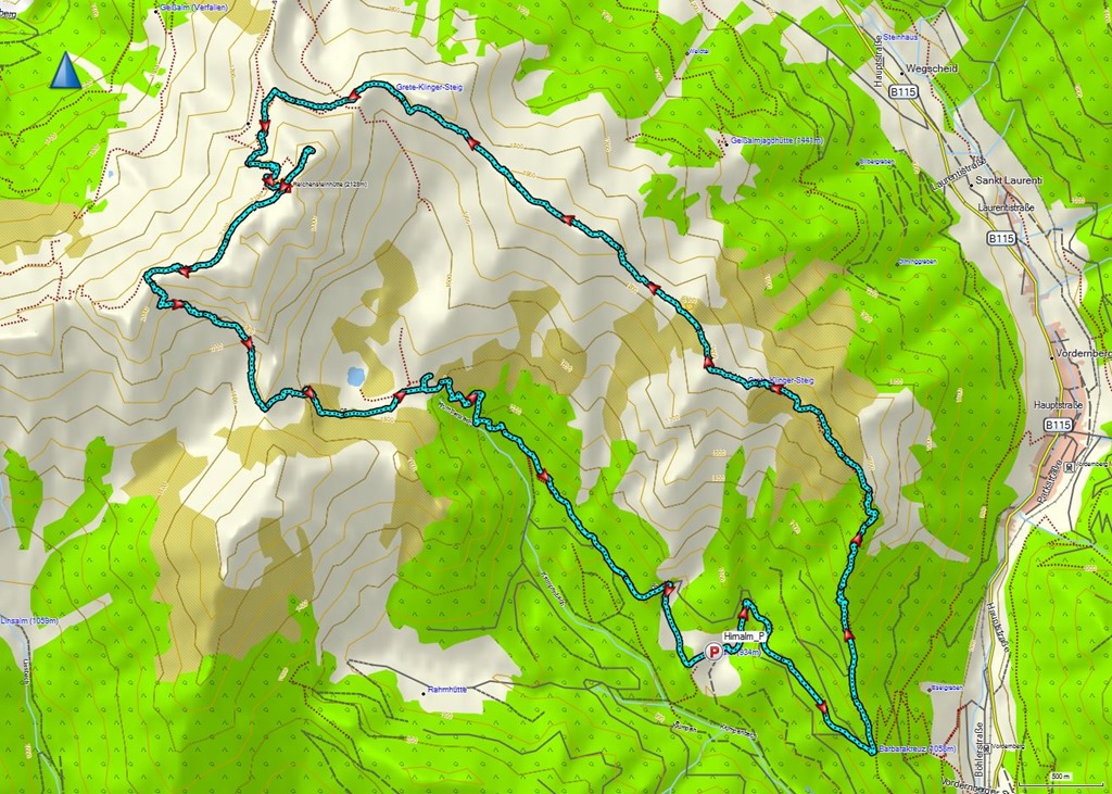 14:00-kor indulunk délnyugati irányban vissza Hirnalmra. Az útjelző tábla szerint 3:30 órával kell számolnunk. Az ösvény először követei az Eisenerz Alpen gerincét, majd egy balraáttal megcélozza az 1700m magasságban lévő Krumphals nyerget. Az ereszkedés nagy odafigyelést kíván. Minduntalan meg-meglódulnak bakancsaink alatt a kisebb nagyobb sziklarögök, miközben télen lavináknak otthont adó, vad árkokat keresztezünk.