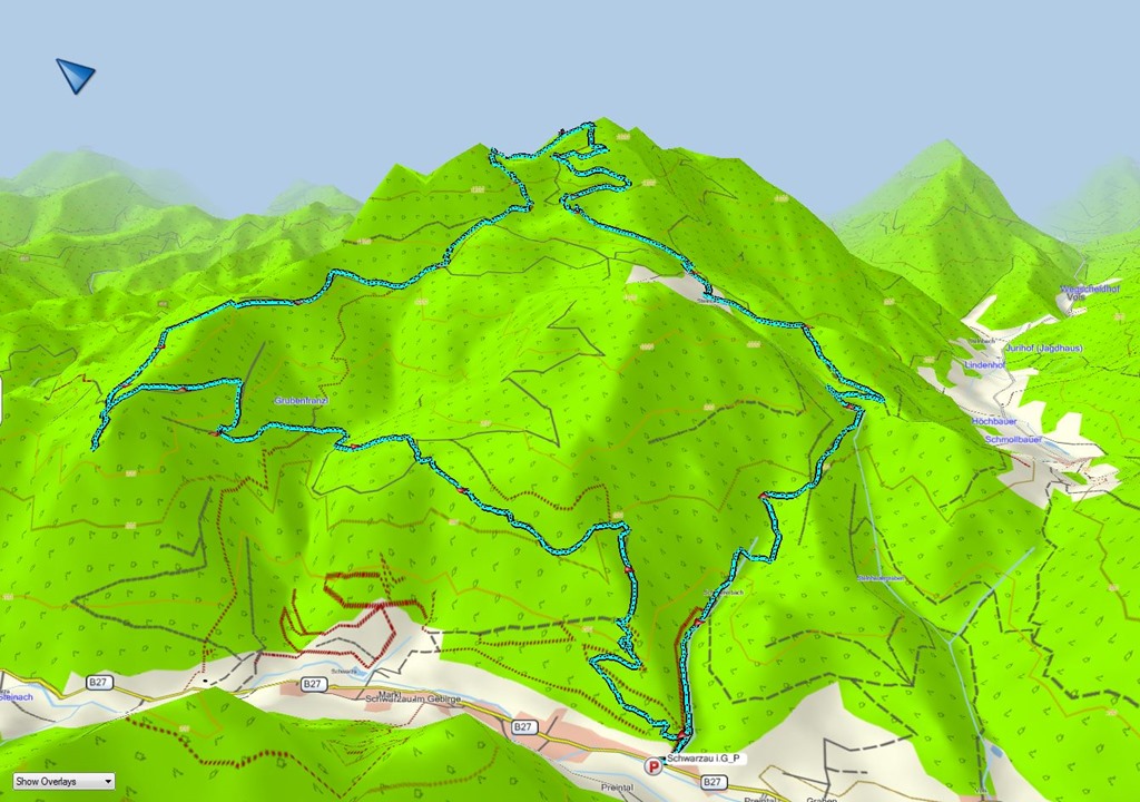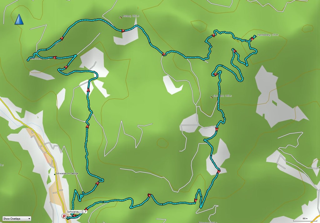 Egy vadlesnél, melyet nem lehet nem észrevenni és amely (vigyázat) egy meredek szakadék szélén áll, kell balra fordulni és egy jól látható jobbra hajló csapáson a vadles alatti mezőre lejutni. Itt aztán nem kell egyebet tenni, mint a mezőről induló széles erdei utat követni, melyet valószínűleg vadászok használhatnak. Hansl im Berg tanya érintésével egy prózai és felettébb unalmasnak tűnő úton ereszkedünk eseménytelenül vissza a kiindulópontban lévő Gasthaus Gruberig. Feltételezem, hogy télen hótalpazásra, avagy sítúrára valamivel alkalmasabb lehet ez a variáns.