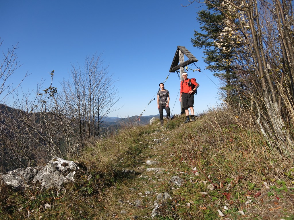 Alig múlik 10 óra, amikor megpillantjuk a Falkenstein szerény fakeresztjét (egy ugyanilyet helyeztek el a szomszédos Obersbergen is). Bár ragyogó a napsütés, mégis megdidergünk a felhevült testet érő fuvallatoktól. Nem is időzünk sokat, hanem leereszkedünk a sziklaoromról és folytatjuk a menetelést fő célunk felé.