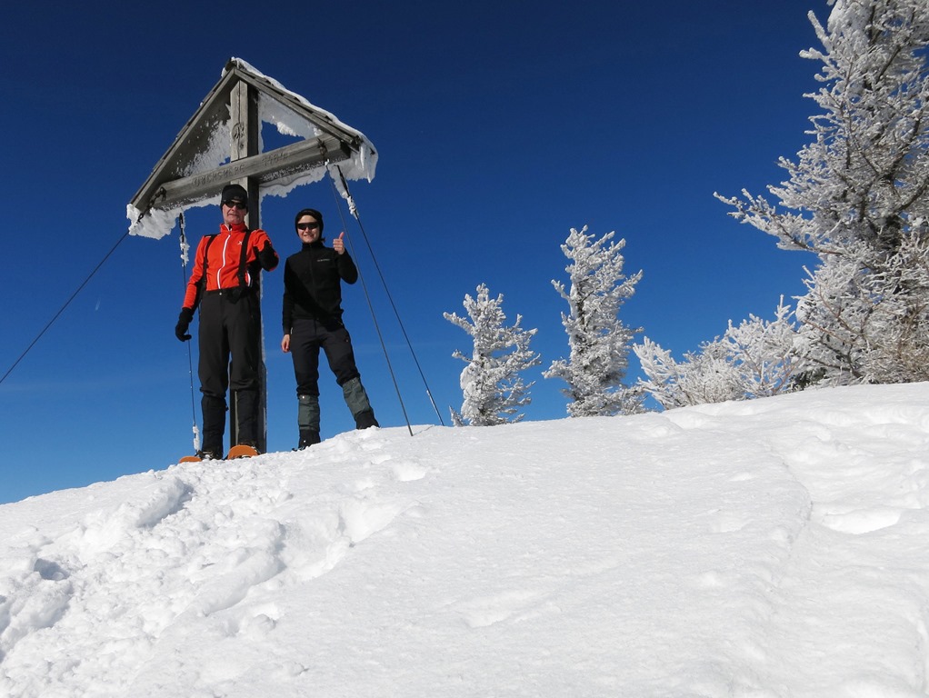 Szinte percről-percre javul az idő, oszladozik a pára és egyre-gyakrabban mutatja magát a nap is. Jól kitaposott nyomon haladhatunk, ami jelentősen megkönnyíti a dolgunkat. A magassággal egyenese arányban vastagodik a hótakaró. Mire az Oberberg csúcs alá érünk a Schneebergről is felszáll a köd és teljes pompájában mutogatja összetéveszthetetlen formájú cukorkupoláit. Ezen a ponton a képbe érkeztünk.
