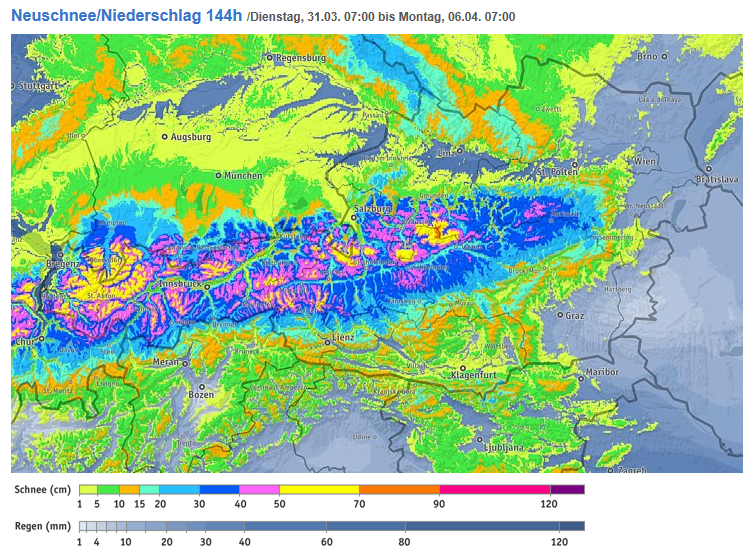 Havat, …de a java még csak most jön! Irdatlan mennyiségű hó áldás ígérkezik ránk szakadni húsvétkor. A legutóbbi 24 óra termése a http://lawine.at -ról és alatta a következő napokra prognosztizált hótakaró vastagsága.