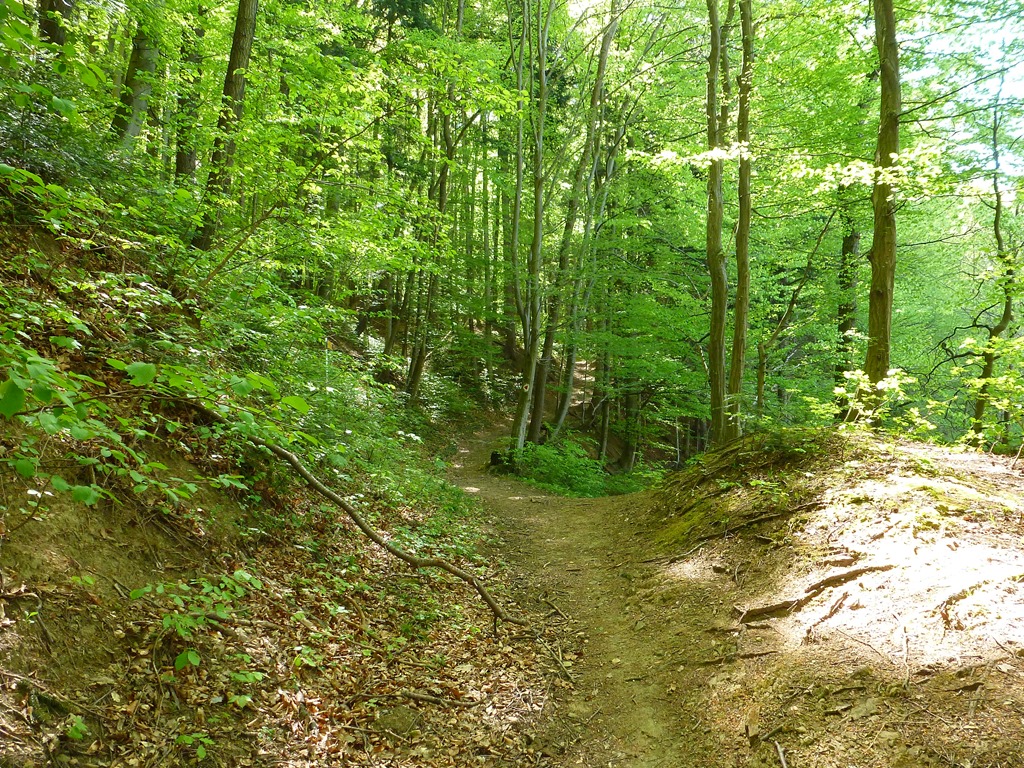 Az első, meglepetés erejével arcul csapó combizmozó szakasz a Steinhäusel tőszomszédságában fekvő Kogl-Berg alatt visz. Itt valszeg elvétem az ösvényt (vagy nincs is), de sikerül a balra a fejem felett jól látható erdészeti útra felverekednem magam. Mivel már elegem van tolni a bringámat (gyökereken és sziklalépcsőkön át), csalok, és a kijelölt csapás helyett a kínálkozó erdészeti úton maradok, ami végül is egész jó döntésnek bizonyul.