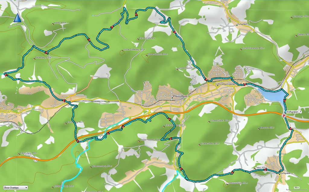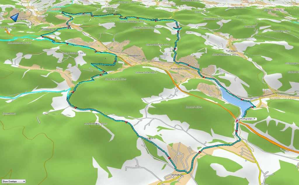 A táv (Wolfsgraben, Pflalzau, Kaiserspitz, Rauchengern, Tullnerbach, Wienerwaldsee, Wolfsgraben) 34km, bruttó 3:00 óra (sorompót is beszámítva) és 700m szintemelkedés |