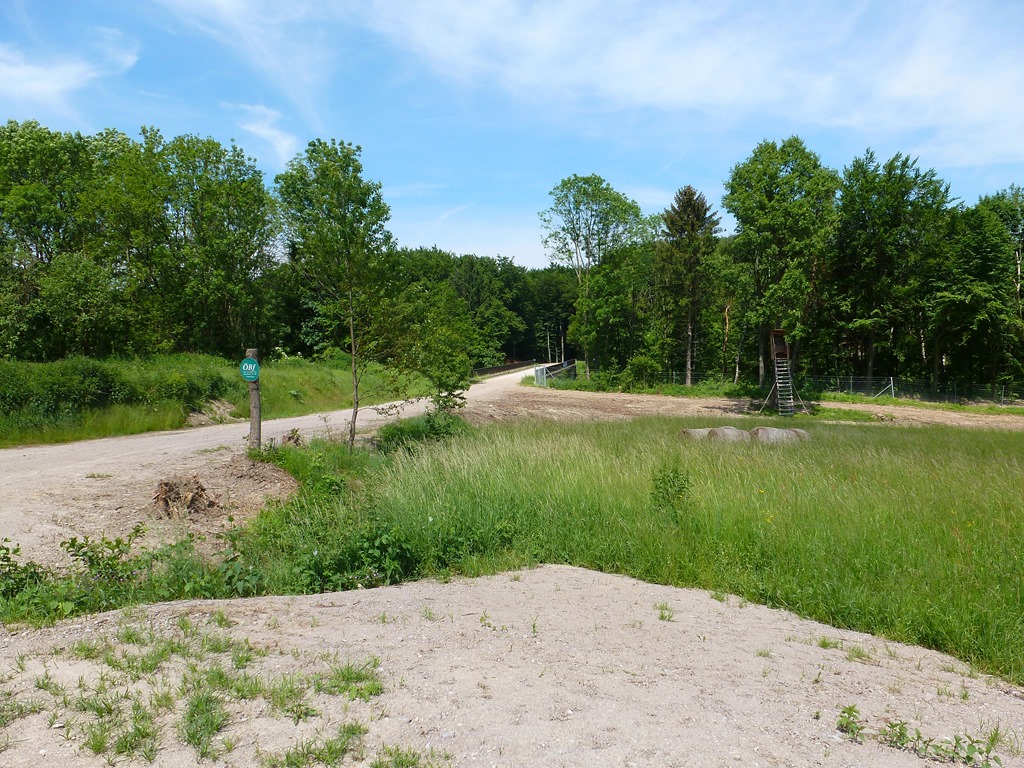 Wolfsgraben északi részén az autópálya viaduktja alatt van egy terjedelmes parkoló. A hivatalostól tehát eltérően innen indulok. Ezzel mindjárt az elején le lehet tudni az egész körút legmeredekebb emelkedőjét, mely Wolfsgrabenben kezdődik és a Tabor (428m) tetejére visz, aszfalton, ami jócskán elveszi a kaptató élét. A Tabor tetején aztán véget is ér az aszfaltozás és kezdődik a túra legszebb része, árnyékos erdőkön, napsütötte mezőkön át.