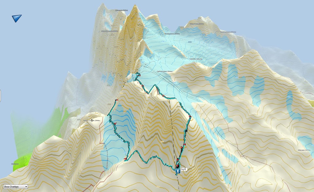Az ereszkedés világos célja az Edelgrieß gleccser. Elképzelhető, hogy más időjárási viszonyok esetén, avagy koranyáron, tavasszal a gleccser felsö része akár két-három méterrel is feljebb van és jobban kitölti a katlant.
