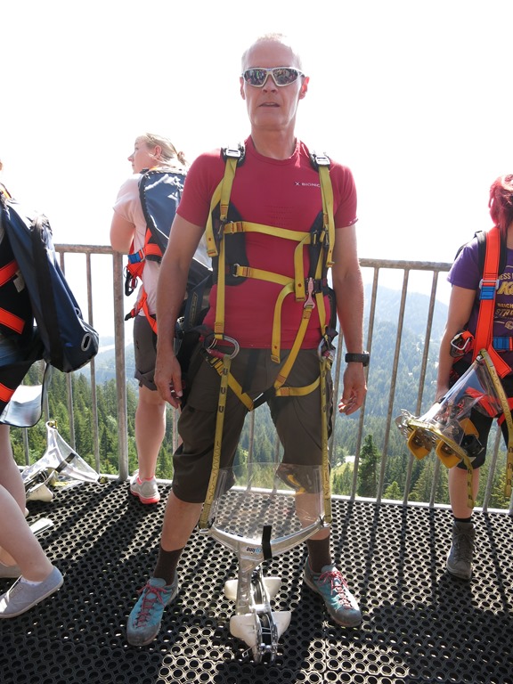 Imígyen felszerelkezve megvárjuk az autóbuszt, mely kb. félóránként érkezik. A busz cirka 15 perc alatt ér fel a hegyi állomás szintjére. Egy szerpentin kanyarjában kiszállít a sofőr és egy széles erdészeti úton, mintegy háromperces gyaloglás után elérjük a tulajdonképpeni rajt-állomást. Itt egy vaslétrán felkapaszkodunk egy vasplatformra, ahol mindenki elkezdi kibontogatni a hátizsákot. Előkerülnek az egész testre szabott spéci beülök, amit ki-ki megpróbál felölteni, a regisztrációnál a kezünkbe nyomott használati utasítás alapján. Aki sikerrel jár, az még összekapcsolhatja magát az alumíniumöntettel is, így teljes a stafírung.