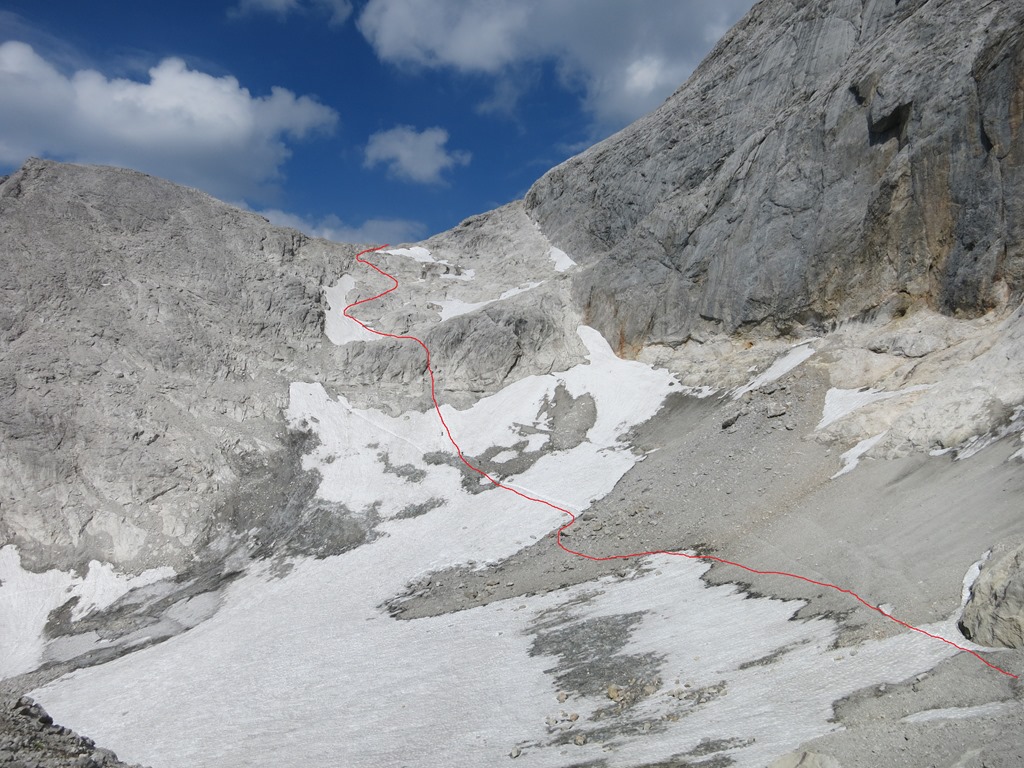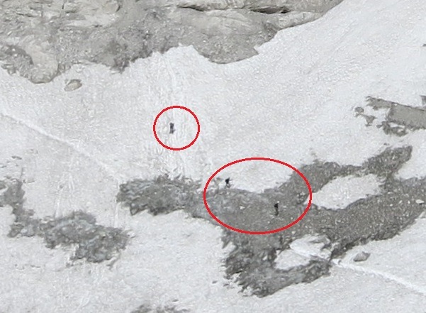 A beszámolóm nyomán Tibi küldött nekem egy fotót arról, hogy milyen volt az Edelgrieß gleccser egy hónappal ezelőtt, azaz 2015. július 10.-én, amikor ők jártak ott. Összehasonlításul, alatta ugyanaz a hely, 2015. augusztus 12.-én. A méretek miatt legalul kinagyítva a kép közepe: jól látható, hogy hárman érkeznek éppen lefelé az Edelgrießen.