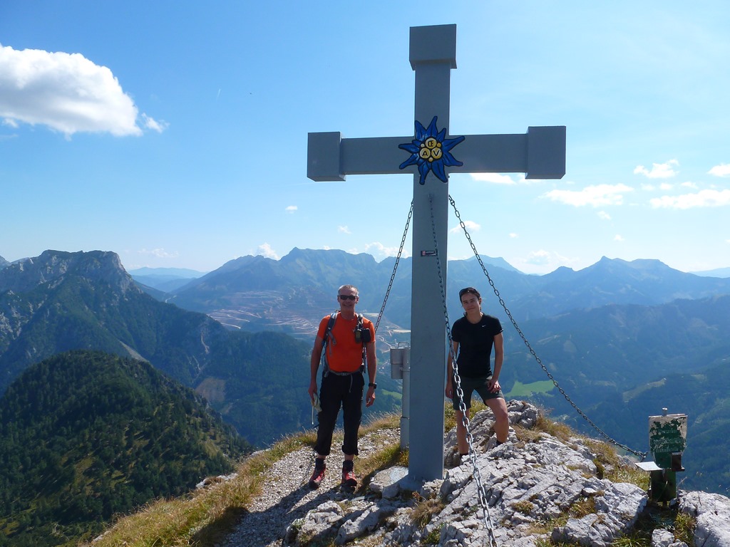Kövekező célunk a Hochblaser 1771m. A turistaúton elhelyezett útbaigazítás szerint a “fekete” út időtartamát 1:00 órában szabja meg. Ha emlékezetem nem csal, gondolom, ez egy kis túlzás. A valóságban 13:30-kor, mindössze fél óra alatt érkezünk a csúcskereszt tövébe. Némi fotózás után úgy döntünk, hogy a hosszabb, de könnyebb, a Leopoldsteiner Seet nagy ívben megkerülő úton szállunk alá. Az ellenkező irányú rövidebb út, egy kifejezetten nyaktörő alternatíva. 2013-as tapasztalataim után egy cseppet sem vágyom rá.
