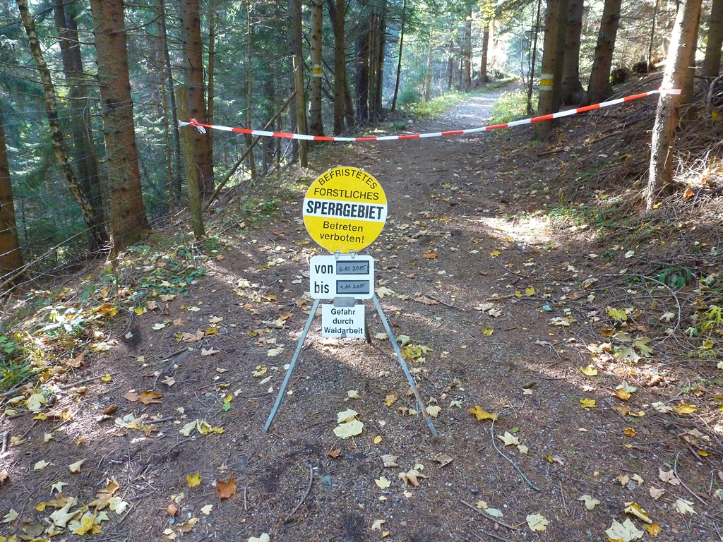 Sajnos alig indulok a Moassa vendégház felé vezető úton, máris belebotlom egy mellmagasságban keresztbe kihúzott piros szalagba és az alatta elhelyezett tiltó táblába. Az út, erdőgazdasági munkálatok miatt november 9.-ig le van zárva. Egy ideig töprengek. Na, most mitévő legyek? Esetleg ignoráljam a tiltást és másszak át a szalag alatt? Folytassam utam, mintha mi sem történt volna? Már többször is megtettem ilyet. Ha nem hallanám a láncfűrész sivítását, akkor minden bizonnyal fittyet hánynék az efféle táblákra, főleg ma, államünnep napján. Így viszont alternatívák után kutatok, és mindjárt beugrik a Karl Kantner-Steig (A/B). Megkönnyebbülten fellélegzem és átprogramozom magam az új célra.