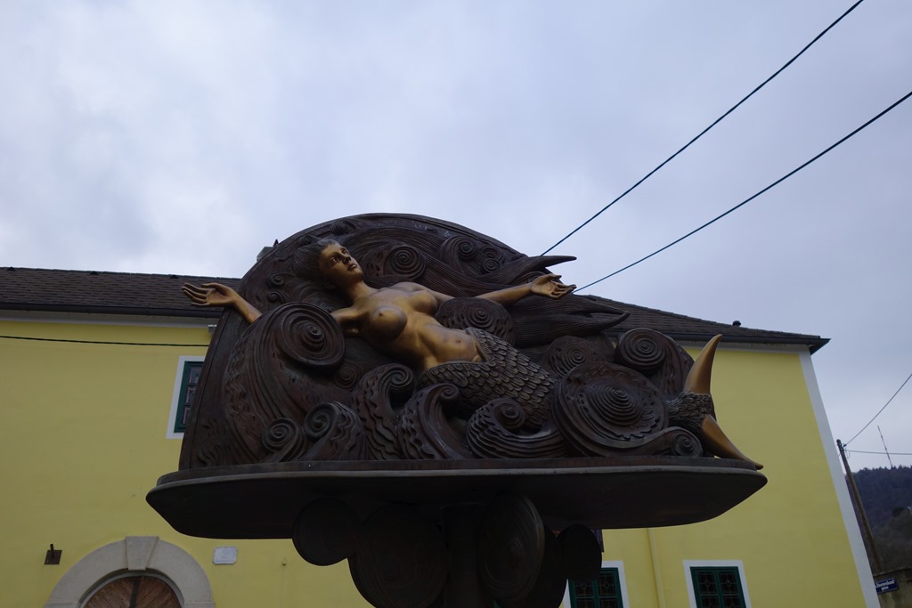 A Duna szintjéről, Kahlenbergdorfból indulok. Elhaladok a bronz-sellő szobra mellett, majd az Eisernehandgassen felbaktatok a szőlődombokra.