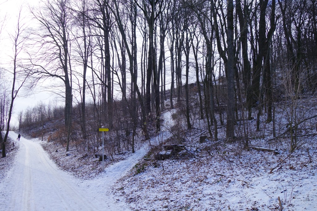Fagyos az idő, egyre több helyen borítja vékony zúzmarás hópiheréteg az utat. A Krapfenwaldlnál jobbra kanyarodom és a Hermannskogel felé vezető ösvényt követem.