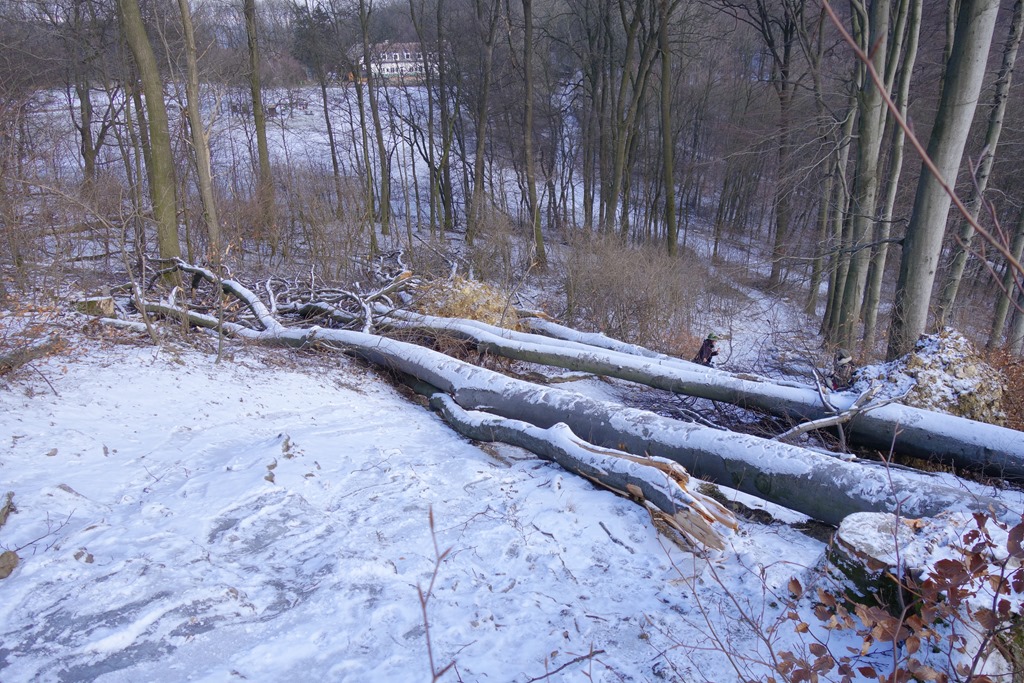 Ráadásul hatalmas szálfák dőltek keresztbe az útra. Nem is olyan egyszerű kikerülni az akadályt. Az ösvény jobb szélén török előre, úgymond árkon, de inkább csak bokrokon által. Erősen kerülöm az út közepe táját, mert a “porcukrozott” réteg alatt alattomos sima jég lapul. Sajnos nincs nálam a spájk, most is jól jött volna.