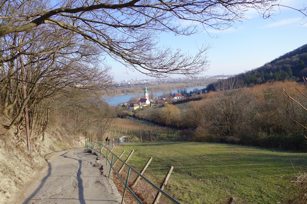 A napsütés aztán elkisér egészen vissza a kiindulópontomig. Az utolsó képen Kahlenbergdorf temploma, a háttérben a Dunával.