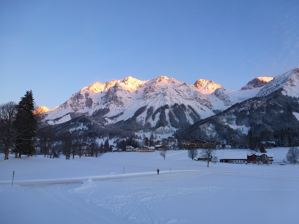 Napkelte Ramsauban. A Dachstein csúcsai köszöntik a nap első sugarait (szemben a legmagasabb a Scheichelspitze, tőle jobbra a Hohe Rams, az Eselstein majd pedig a Sinabell)