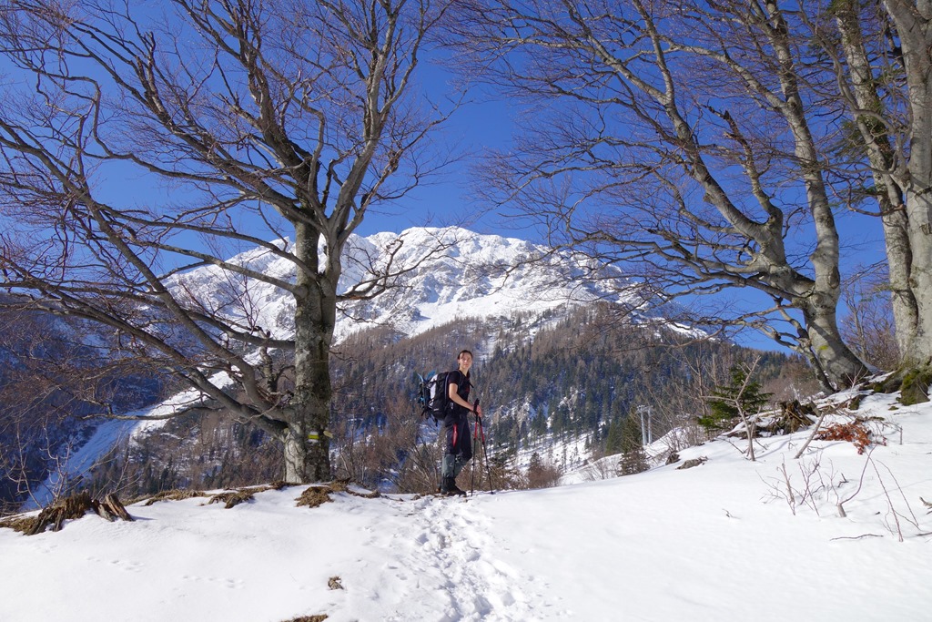 A nyári időszámítás, mely pont ezen a napon veszi kezdetét, kissé összekavarja az időérzékünket, így még a “régi”, a téli időszámítás szerint rugaszkodunk neki a Fadensteignek. Losenheimből indulunk, amikor 9:05 mutat az óra (azaz a régi szerint 8:05, de ezt most már felejtsük el). Tán mondanom sem kell, hogy az elején inkább a sarat dagasztjuk, semmint havat. De ezt a játékot mi már sokszor eljátszottuk, most sincs másként. Az első nedves hófoltokat összefüggő hótakaró követi és az Edelweißhütte szintjén máris megérkezünk a teljes és hamisítatlan télbe.
