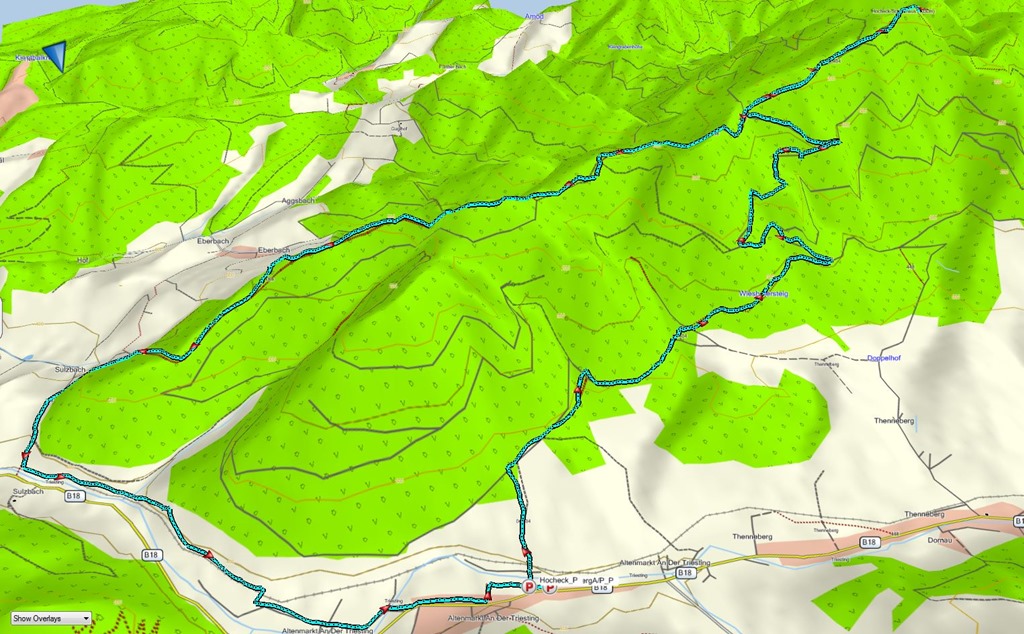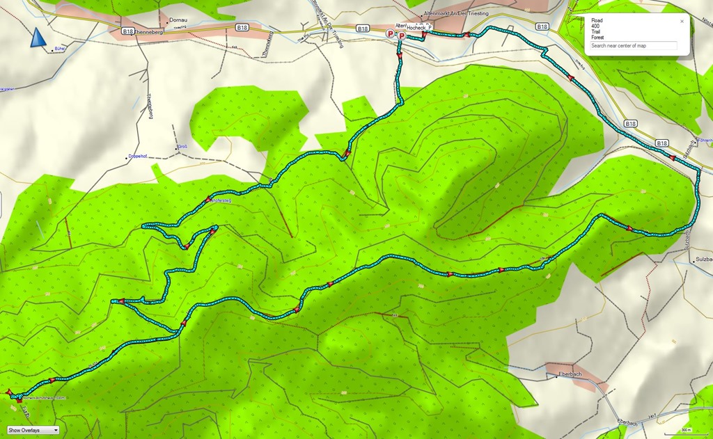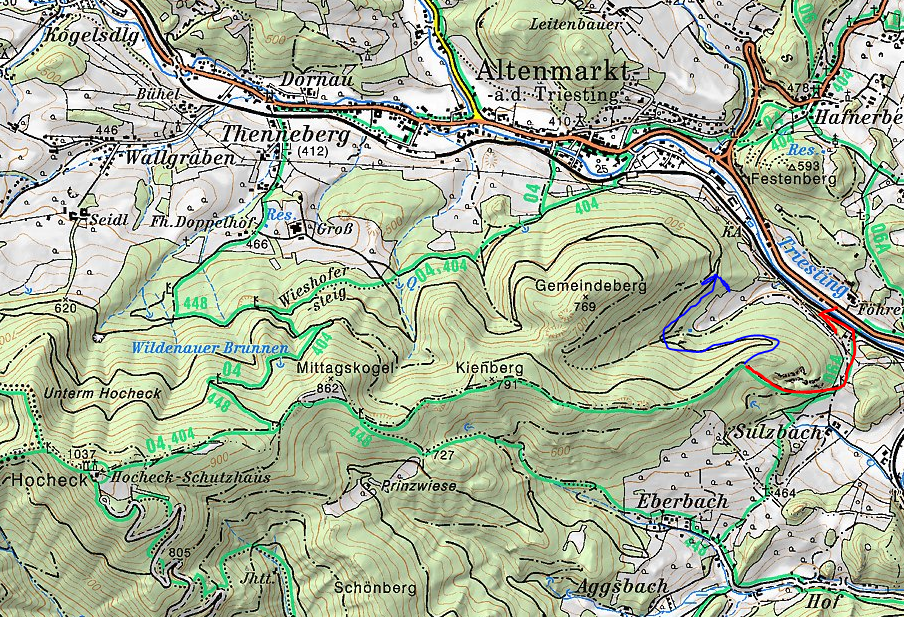 Érdemes még tán megemlíteni, hogy a képen (lejjebb) pirossal jelzett, általunk választott útvonal a végén a Triestingtal kerékpárútba torkollik, és ezen visszagyalogolni (enyhén szólva) nem túlságosan élmény dús. Érdemesebb tehát a kék nyíl szerint, a jelöletlen erdészeti úton alászállni Altenmarktba (mint azt első 2010-es látogatásom során tettem).