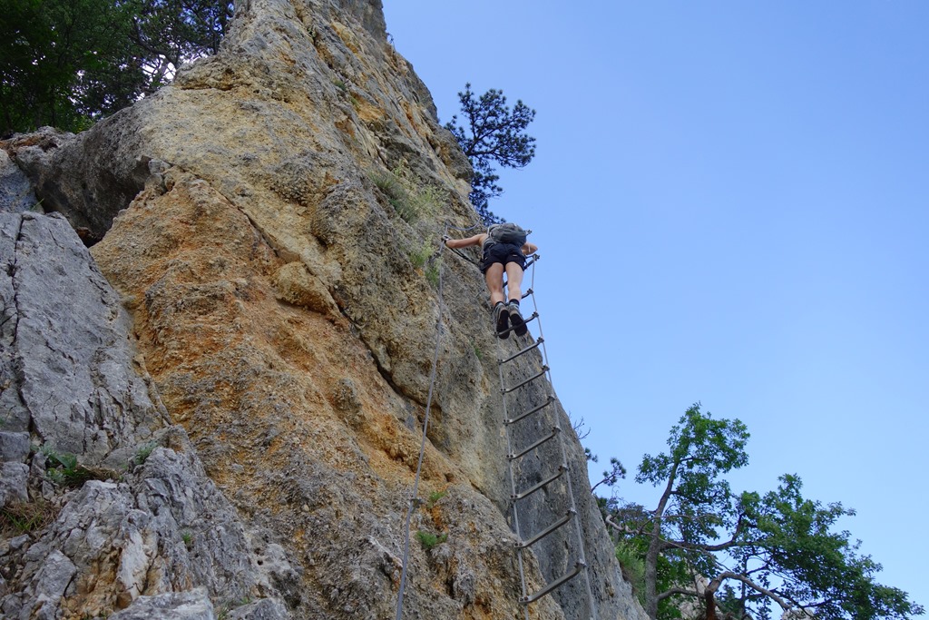 A szikla felülete végig remek, csontszáraz. Nem kell tehát sehol harcot vívni a nedvesség ellen. Cirka 50 perc alatt végzünk a Gebirgsvereinsteiggel. Gyorsaságunk fő oka a szabad pálya. Sehol sem kell senkire várakoznunk. A platóra kiérve aztán megbeszéljük, hogy bejárjuk még a közeli Steirerspurt is (ha már egyszer itt vagyunk).